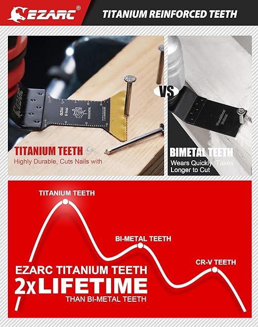 - 【Titanium Enhanced】Bi-metal oscillating saw blades with Titanium coated teeth for heat resistance, long life. With strong wear resistance, this multitool blade lasts 2 times longer than usual blades, giving you more durability than you'd expect