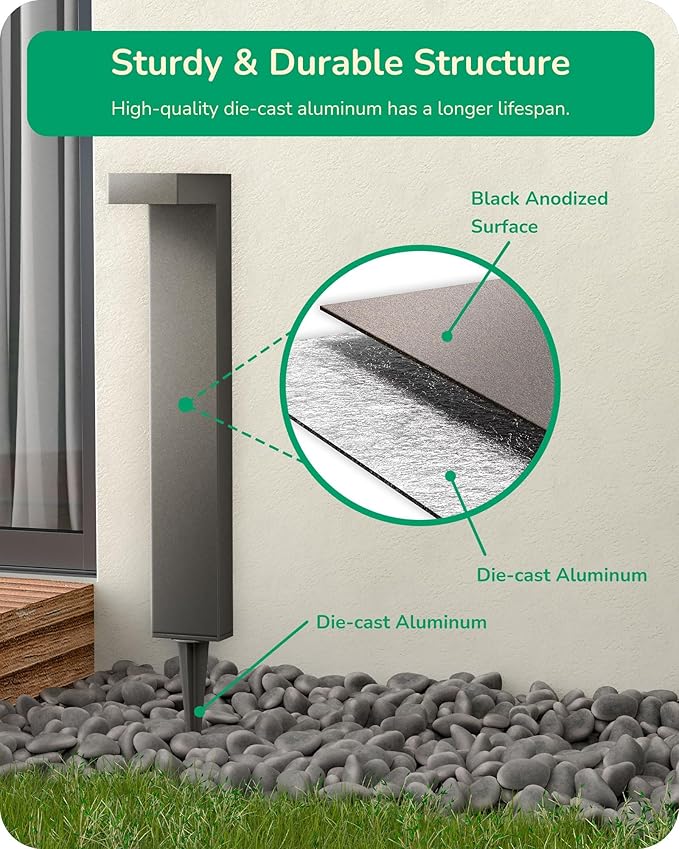 - 【Durable Construction】All structures with heavy duty die-casting aluminum material, IP65 water resistant and anti-corrosion, this outdoor path lighting can work well even in rain and snow or other inclement weather conditions from -40°F to 140°F; LED light bead can run up to 50,000 hours, save over 88% on your electric bill