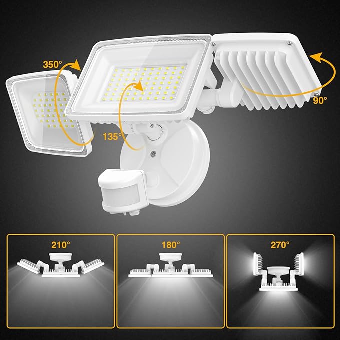 - ADJUSTABLE DESIGN & EASY INSTALLATION: The 3 heads of this security light can be adjusted to cast light in a 270-degree detection zone, so you can see everything that’s happening in your yard; And just within 3 steps, you can start lighting your yards