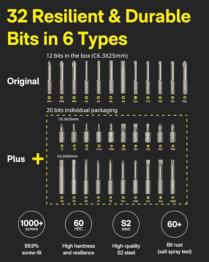 - DIY DREAM KIT IN A BOX! - Unlock your DIY potential with this all-inclusive kit: 1 x Cordless Screwdriver, 2 x Set of 32 Bits (12 in the Storage Box, 20 Extra), 1 x Aluminum Storage Box, 1 x USB Type-C Charging Cable, 1 x User Manual. Bit Assortment: Philips: PH0, PH1, PH2, PH3, Hex: H1.5, H2, H3, H4, H5, H6, Torx: T10, T15, T20, T25, T30, Flat Blade: SL3, SL4, SL5, SL6, Pozidriv: PZ2, Square: S1, S2.