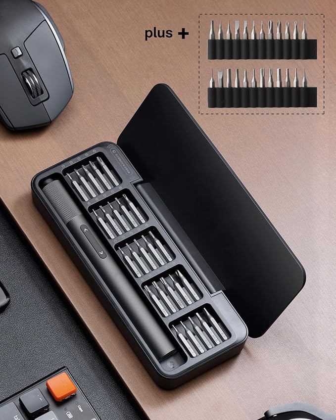 - Magnetic Design for Hassle-Free Organization: The mini electric screwdriver set includes a magnetic, semi-automatic flip lid case, keeping 25 precision bits neatly stored and easily accessible. The magnetized screwdriver tip allows for effortless bit changes, ensuring a smooth and efficient workflow. No more losing tiny screws or searching for missing bits!