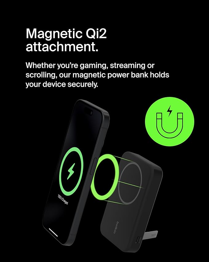 Belkin Portable Charger, Wireless Power Bank 15W 8000 mAh w/ Qi2 - MagSafe Charger w/Built-in Pop-up Kickstand - Compatible w/iPhone 16, 15, 14, 13, Plus, Pro, Max, Google Pixel 10, etc. - Black