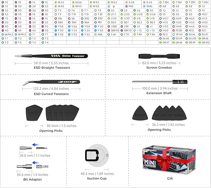 - 【 Compact Screwdriver Set 】This small screwdriver repair tool kit shaped like a container, allowing multiple sets to be stacked. 160 common magnetic bits are built into the 4 partitions for easy access and won't fall out. Each bit is marked with standard or inch markings for quick identification of the screwdriver tip you need. Also included are straight and curved ESD tweezers, opening picks, crowbars, extension shaft, bit adaptors, suction cup for easy screen removal and easy carrying.