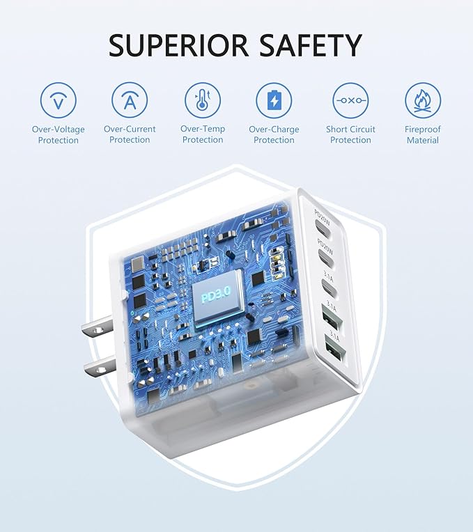 - Safety and Reliability:The USB C Wall Plug is made of ABS + PC fireproof material,with protection against overheating, overcharging, overcurrent, overload, and short circuit, which can automatically protect the device and greatly extend its battery life. Charging will be automatically stopped when the battery is full.ensuring that your digital device always charges safely