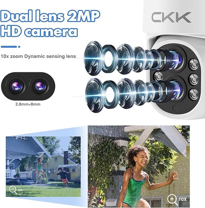 - 【PTZ 360°Camera & 10X Zoom】 4Pcs Dual Lens PTZ Security Camera comprised of a 2.8mmtelephoto lens and an 8mm wide-angle lens, CKK Cameras can rotate all around - 355° Pan / 90°Tilt/10X optical zoom, enabling adaptation to various monitoring scenarios and enhancing monitoringdetails