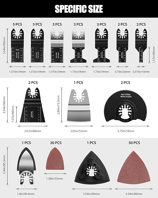 - 112Pcs Oscillating Muti Tool Blades Kits - AVID POWER oscillating saw blades kits include different types of blades, two sized sandpaper and sanding pads, as well as 2 c-clips for your choice. The diverse blades are very sharp and tough, can be safely used when you are cutting metal/wood/plastic, removing grout, paint and adhesive residues for home repair or renovation jobs