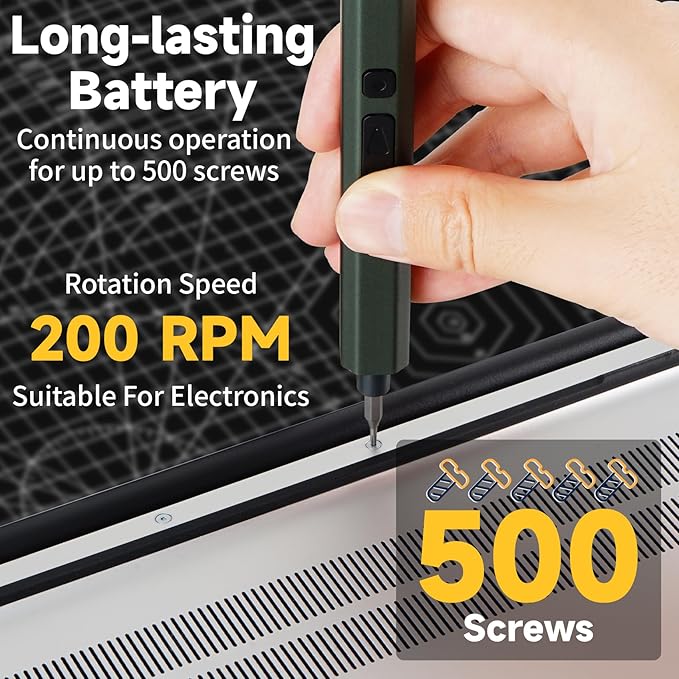 - 【Long-lasting Battery】This cordless mini electric screwdriver is powered by a 350mAh rechargeable Lithium Battery. It quickly charges in just 1 hour which can tighten up to 500 screws on a full charge.The robust motor has a maximum speed of 200 RPM, making hard work ease.