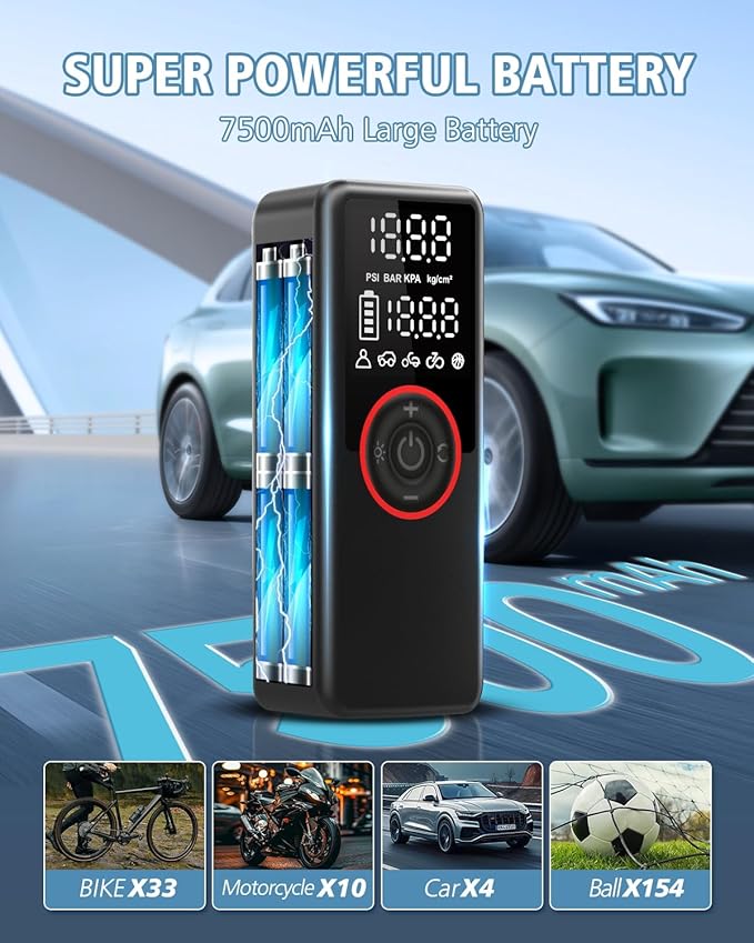 - 7500mAh Large Battery Capacity: The all-in-one portable air compressor for car tires has a power bank that allows you to pump up to 4 car tires, 10 motorcycles, 33 bicycles, 154 balls. The power bank can also be used to charge your phone or tablet so you are not stuck with out communication in an emergency.