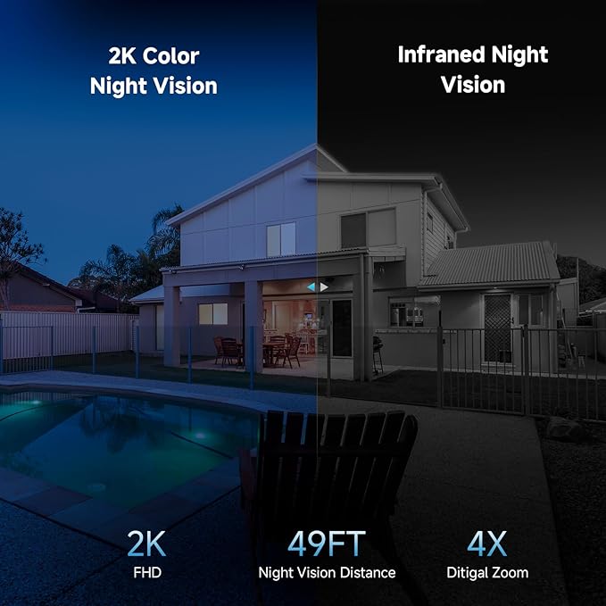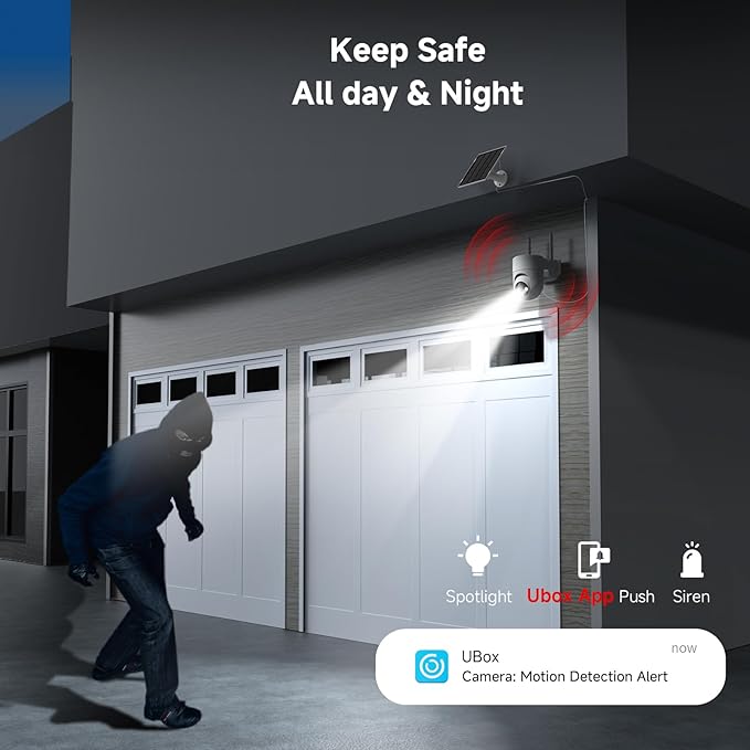 - 【Versatile Alarm Options & Real-Time Communication】 Benefit from 3 alarm modes - audio warning, spotlights, and Ubox App push notifications - to deter intruders effectively. Enjoy 2K color night vision for enhanced security, and utilize two-way audio to communicate with family, visitors or intruders in real-time