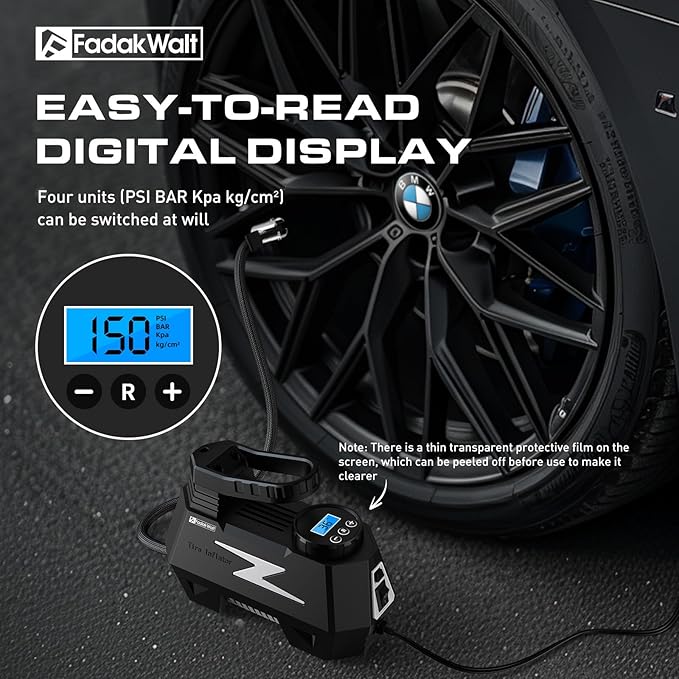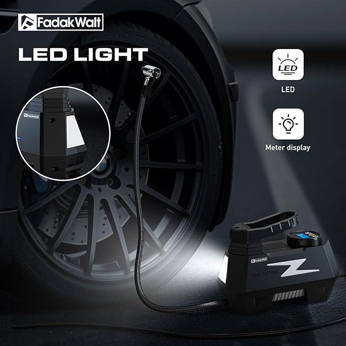 - Digital Display & LED Lighting: The FADAKWALT inflator features PSI, BAR, KPA, and KG/C㎡ modes, with an LED light for use in low light. The bright pressure gauge is readable even in the dark or strong sunlight