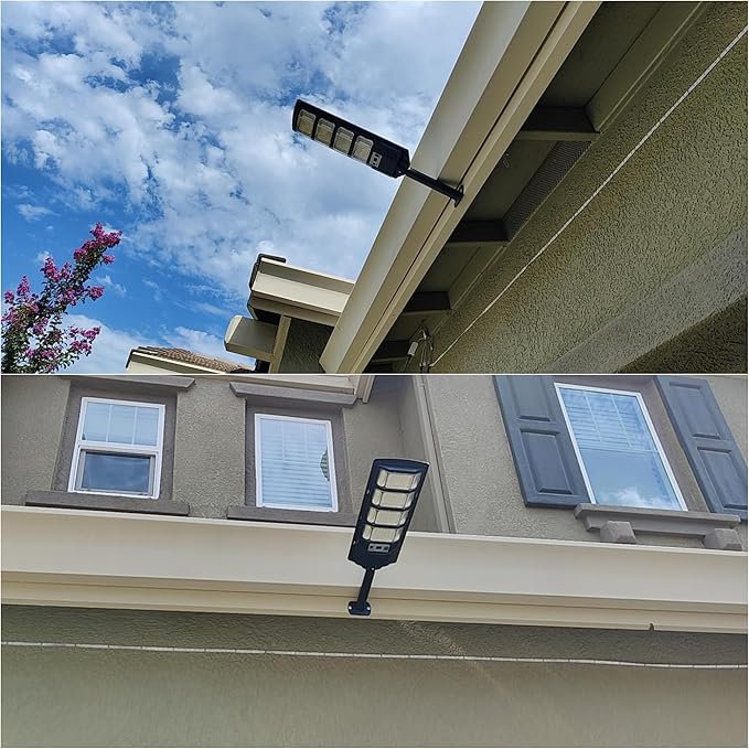 - [ ANGLE ADJUSTABLE & EASY TO INSTALL ]: With 180-degree active joints and arms, you can adjust the arm and panels flexibly. Solar Street Light Outdoors is easy to install, only two screws are needed to fix it. Great for streets and roads, parking lots, basketball courts, garages, gardens, streets, patios, farmhouses and swimming pools, etc.