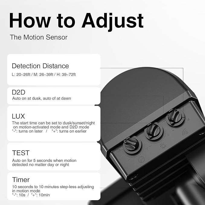 - AUTOMATIC OPERATION: Motion sensor activation turns lights on for 10 seconds to 10 minutes when movement is detected up to 72 feet away for hands-free convenience