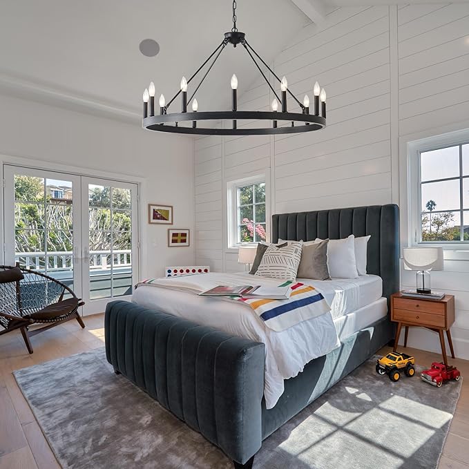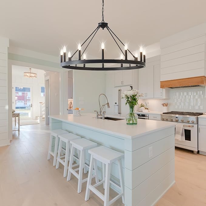- ๐ใfarmhouse Wagon Wheel Chandelier ใ- 40โ 12-light Barn Wheel Chandelier features a innovative wagon wheel design. This extra large chandelier is constructed using durable, high quality metal materials. No matter where you place it, you will enjoy the fixture's soft illumination and beautiful look.