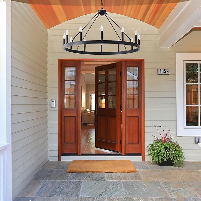 40 Inch Black Farmhouse Wagon Wheel Chandelier,12-Light Round Industrial Pendant Light fixtures for Outdoor Porch high Ceilings Living Dining Room Foyer Entryway
