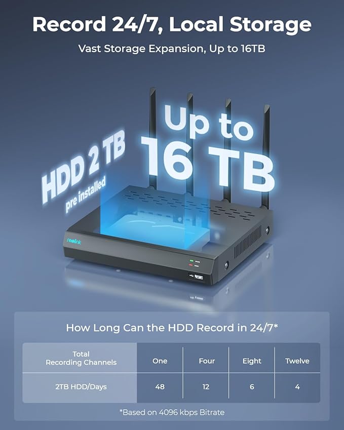 - EASY TO DIY YOUR OWN SYSTEM: Accommodating up to 16 Reolink IP cameras (up to 12 plug-in Wi-Fi and PoE cameras) and compatible with all Reolink cameras (except 4G cameras), this wireless NVR system provides great flexibility to craft your customized surveillance system according to your needs. (This Wi-Fi NVR does NOT support power over Ethernet technology, so network and power cables or a Reolink PoE switch is recommended when used with PoE cameras; when used with battery Wi-Fi cameras, the cameras and NVR need to be upgraded to the latest firmware.)