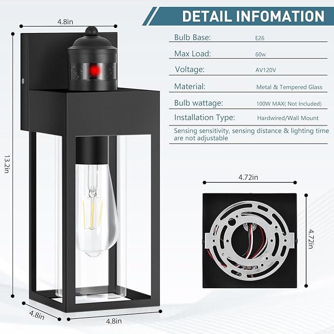 - 【Smart Dusk to Dawn & Motion Sensor Light】 This outdoor wall light uses a PIR motion sensor and dusk-to-dawn sensor to provide energy-saving, environmentally friendly, and safe lighting with highly sensitive motion detection, perfect for all your outdoor lighting needs.