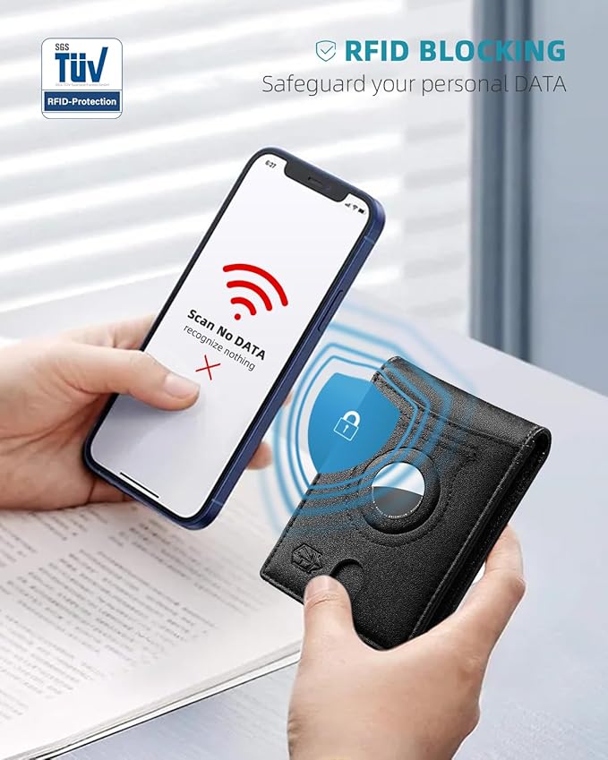 - ๐๐๐ ๐๐๐.๐๐๐๐๐๐๐.๐๐๐๐๐๐๐ - our wallets are equipped with German institute certified RFID SECURE Technology, a unique metal composite, engineered specifically to block 13.56 MHz or higher RFID signals and protect the valuable information stored on RFID chips from unauthorized scans.It is ideal for carrying business cards, credit and debit cards, bills et