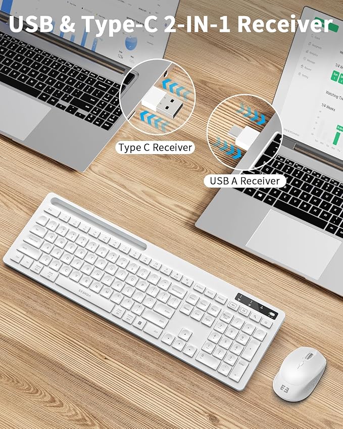 - Wireless Convenience with Versatile USB A/C Receiver - Experience the ultimate freedom of movement with this white wireless keyboard and mouse. The 2-in-1 USB A/C receiver allows for seamless compatibility with various devices. Simply plug it directly into your computer's USB A port, or connect it to your Mac, MacBook, or Chromebook with Type C ports. Enjoy a reliable wireless range of up to 33ft