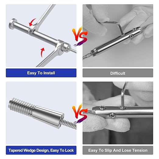 - 【Patent Design】Patent Pending, Swageless Cable Railing Hardware Kits, Easy To Insatll, No Crimping Tools. This saves both time and money on tooling equipment.