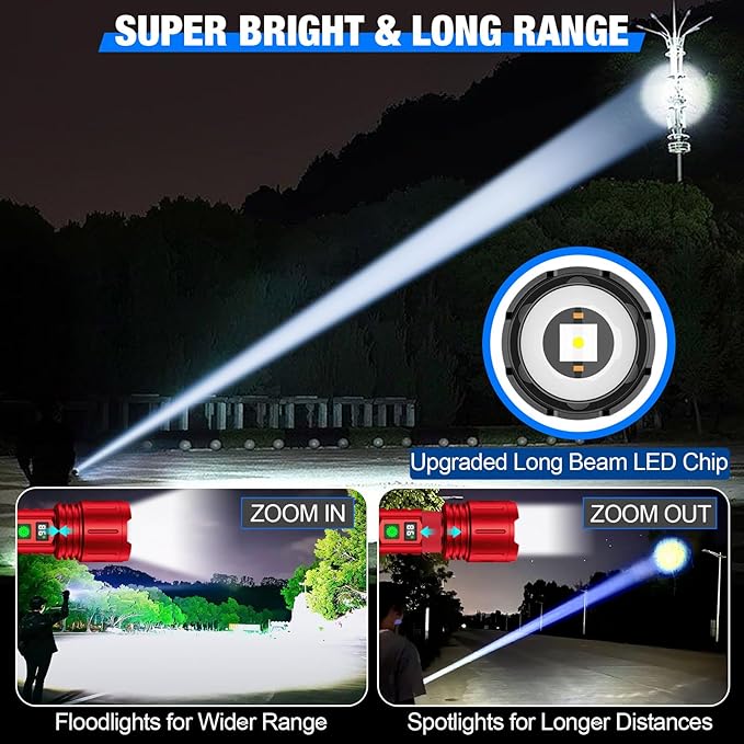 - 【LONG LASTING USE & LCD POWER DISPLAY】After our test, the powerful flash light can last for up to 8 HOURS at high mode, and last for up to 20 HOURS at low mode. This led rechargeable flashlight has been newly upgraded with the unique LCD power percentage display, so you can quickly judge how much power is left. Equipped with 5000 high-capacity rechargeable ba-tt-ery, don’t worry about power problems.