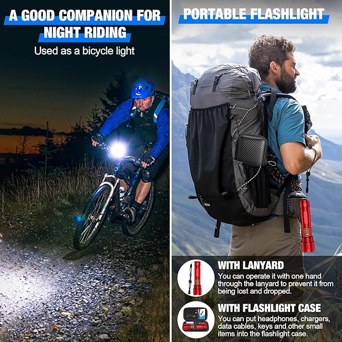 - 【TYPE-C FAST CHARGING & POWER BANK】This rechargeable tactical flashlight has a built-in TYPE-C input charging port, only need 4 hours to get the fully charged. Equipped with a TYPE-C cable, can be charged by any USB port, such as adapters, laptops, car chargers, power banks, etc. When there is a sudden power outage at home or an emergency outdoors, the flashlight can also be used as an emergency power bank to charge your phone.
