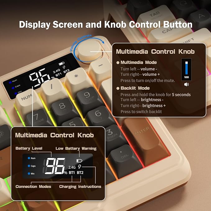 - 【Display Screen & Knob Design & Multimedia Hot Keys】The gaming keyboard built-in LED display screen can intuitively display the keyboard status, including caps lock, connection mode, WIN/MAC, battery. Built-in knobs allow quick adjustment or mute of loudspeaker volume. 12 multimedia keys give you quick access to common functions, improve workflow efficiency.