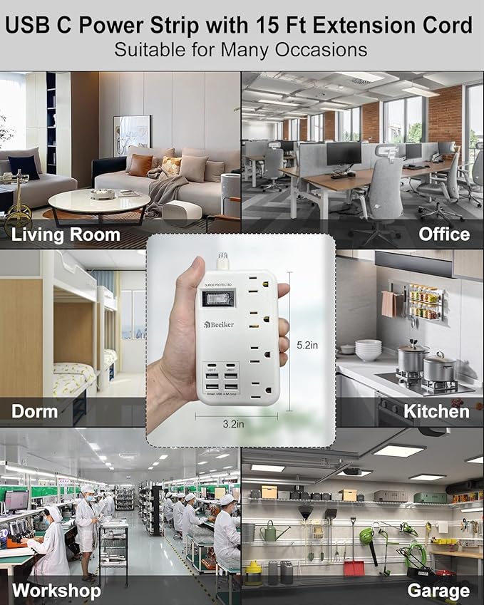 - 【Multiple Safety Protection 15 Ft Extension Cord】The 15ft surge protector power strip is certified by FCC, and made of Fire-resistant PC shell, with built-in multiple security module safeguards your electronic devices from surge,short circuit,over-voltage and over-current. 980J Surge protection rating to keep your electronics and mobile devices protected from voltage spikes.Lighted on/off switch with integrated circuit breaker for overload protection of all outlets.(Beeiker provides 12-month replacement and 24h service)