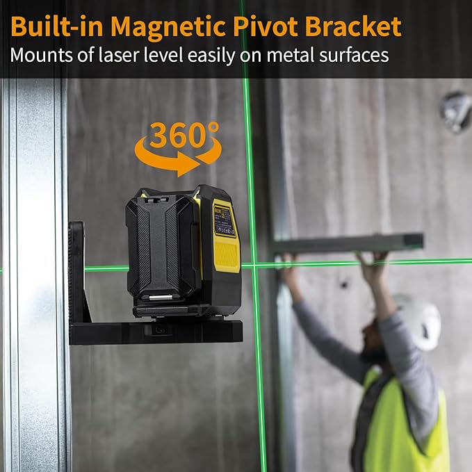 - 【FLEXIBLE MOUNTING】: The laser level tool has integrated magnetic bracket features micro-control and pivots on the plumb point for easy and fast alignment. The amplified rare earth magnets provide a stronghold and will not slide on steel studs, while an integrated hang hole and 1/4"-20 mounting thread makes setup easy and efficient in any environment.