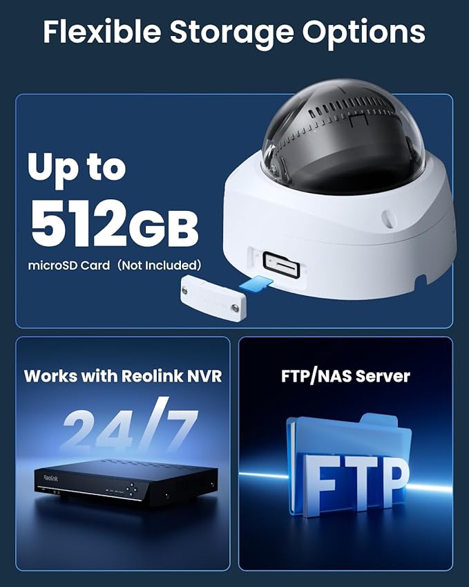 - MULTI-PLATFORM ACCESS & VARIOUS RECORDING OPTIONS: This camera enables multiple-user access, smart playback, and two-way talk for enhanced surveillance capabilities. Recordings can be conveniently stored on microSD card, Reolink NVR, FTP, or NAS, utilizing H.265 high-efficiency video compression for optimized storage efficiency.(Note: The PoE NVR/switch/injector and DC power adapter are not included.)