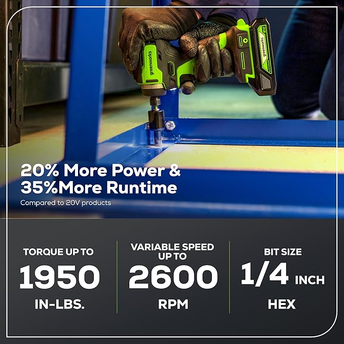 - GREENWORKS 24V LITHIUM-ION BATTERY: Provides 20% more power and 35% more run-time compared to 20v products, and delivers fade-free power with no memory loss after charging. Also,overmold cushioned grip to reduce user fatigue and reduce vibration.We've got your back: Greenworks power tools come with 3-year tool & 2-year battery limited warranty and friendly customer service.