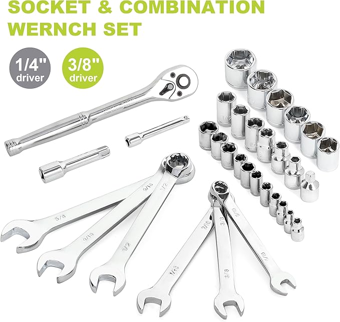 - The sockets and combination wrenches are made with heat treatment, chrome plated and polished for durability. Includes 3/8" and 1/4" SAE sockets useful sizes to satisfy your general automotive repairs work.