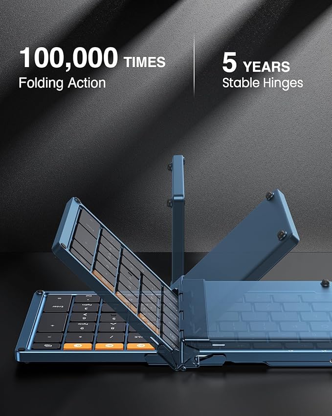 - 【Business Travel Essential】The collasible keyboard can folds into a small size(8.46 x 4.68 x 0.78 in) for taking on the go. Internal aluminum hinges survive 10,000+ folds, tougher for frequent trips. The rigid hinge maintains keystroke stability whether you're at a coffee shop or airport lounge