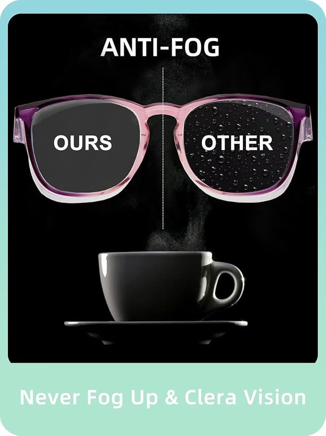 - ANTI-FOG LENS - Another most important feature of our safety goggles is the anti-fog lens. It comes with double-side coating, which keeps vision clear even drinking hot water. Furthermore, the anti-fog feature could last about 2 years
