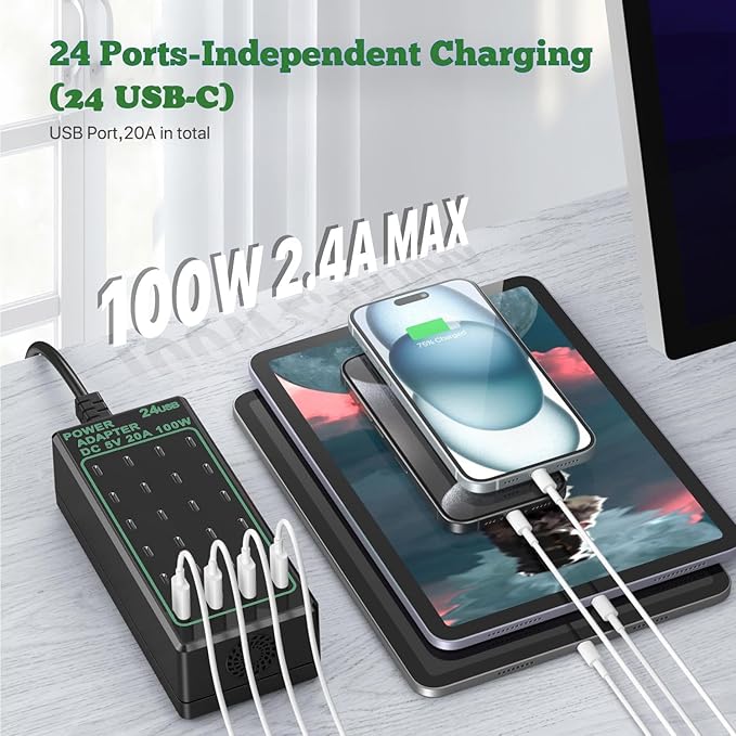 - ✅【100W 24 USB C Ports Charger】 The wall mounted hub charger provides 24 USB C ports, each port can reach 2.4A or 20A in total, with a total power of up to 100W, And when you connect multiple devices, power will be distributed efficiently between USB C Charge ports to ensure you get the best charge, same time and frees you from messy chargers with various interfaces.