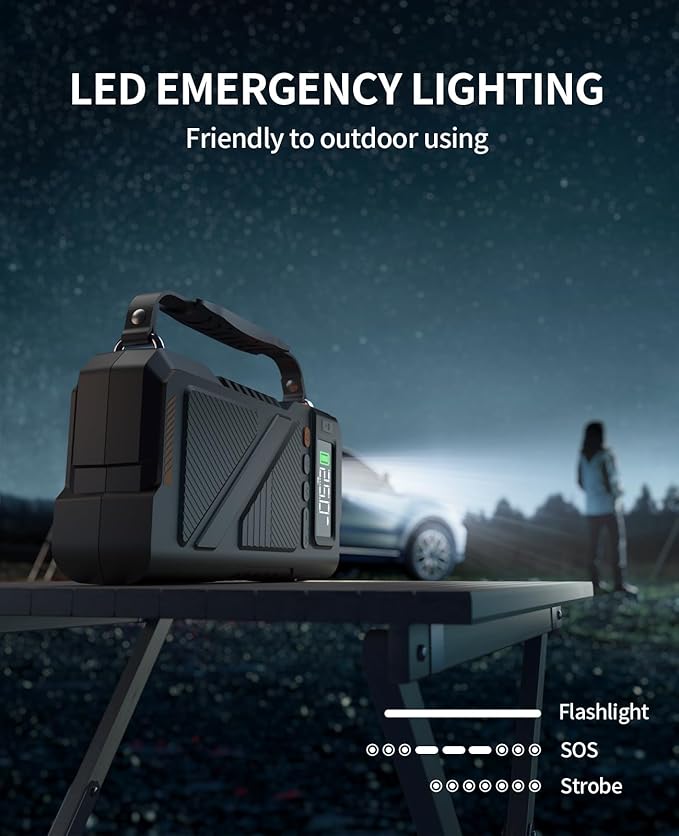 - 7 in 1 Jump Starter: The car jumper starter features car jump starter,tire pressure detection, car tire inflation, power bank, 3-mode emergency lights (flashlight, SOS, strobe). Compact and powerful, it's a great choice used for outdoor road trip