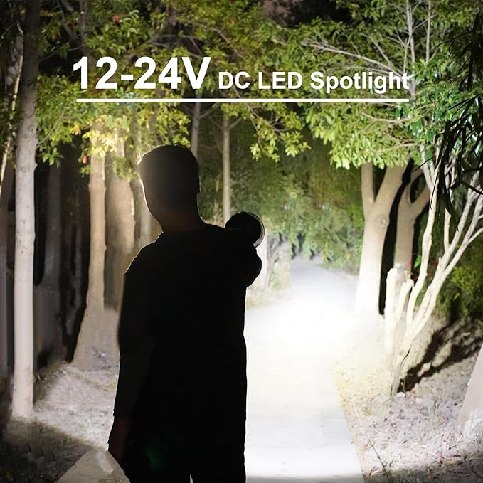 - 12 VOLT LED SPOTLIGHT: The spotlight's head is equipped with high-quality LED that provides a bright, white light, ideal for both close-range tasks and distant searching. The LED technology also ensures high efficiency and durability, offering a long lifespan