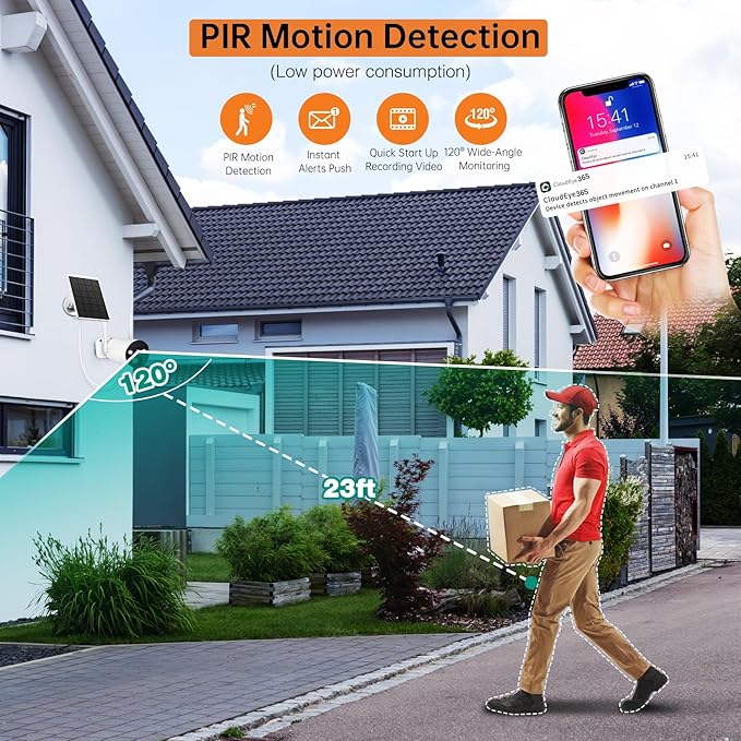 - SMART PIR MOTION DETECTION: The Solar security cameras wireless outdoor with 120° detecting angle uses a highly sensitive PIR motion sensor, only warm human body or mammal will be detected by PIR sensor, and it will push alarm to the App. Once the PIR sensor outputs a pulse signal, the camera will be activated and enter the recording state. The PIR induction distance is 32ft. The recording time can be adjusted as needed.