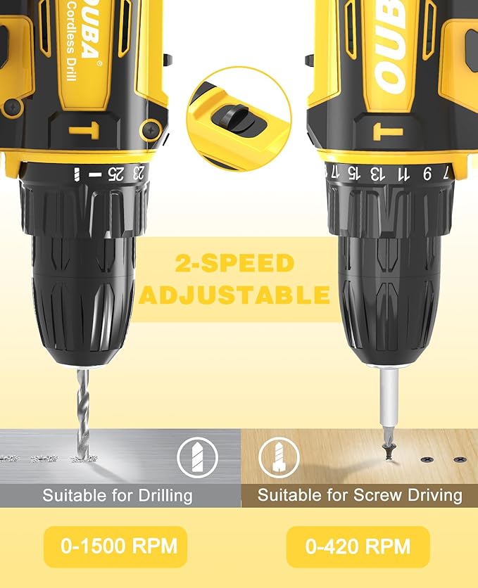 - [Experience Enhanced Torque]: Our electric drill cordless provides an exceptional torque experience, thanks to its 2 variable-speed settings (0-450 & 0-1200 RPM). This combination offers unparalleled versatility for drilling into various materials and accommodating a wide range of bits. With the ability to select the perfect speed for any task, you'll always have the right power at your fingertips