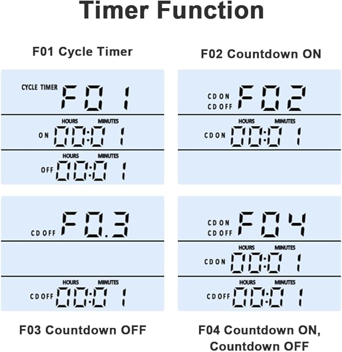 - ③【Extra Function:Timer】The thermostat socket has F01-F04 timer function, you can use it as a timer switch. The home appliances can work in cycle In F01 mode. If you just need it to work once, you can choose the F02-F04 countdown mode.
