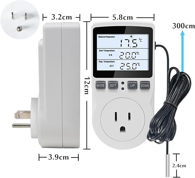 - ④【with 3m temperature sensor】The thermostat socket is supplied with a 3m NTC10K/B3950 temperature sensor, and the temperature controller can display ℃ or ℉, calibration function can improve the accuracy. Reset Function make it easier to change to control other home appliances.