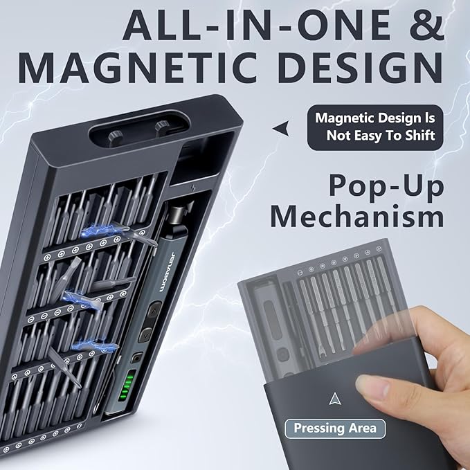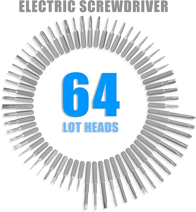 - 【68-IN-1 Multi-Purpose】This micro electric screwdriver kit is equipped with 64 different types of S2 steel bits, 1 electric screwdriver, 1 magnetizer/demagnetizer,1 metal spudger, 1 tweezers. 1 type-c charging cable.