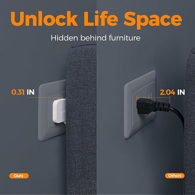 - Flat Plug Power Strip: With only 0.31 in ultra thin flat head design, flat wall plug can easily fit in tight spots and hide behind sofa, bed, nightstand or other furniture, sitting flush against the wall; 45° right angle design create an extra space for other plug below without blocking