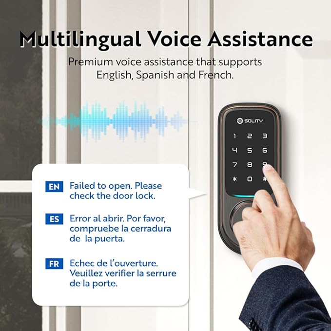 - Multilingual Voice Assistance and Responsive Touchscreen: Navigate your lock settings and features with voice-guided support in multiple languages, including English, Spanish, and French, commonly used in the United States. The responsive touchscreen ensures quick and easy entry, further enhancing user experience with a friendly voice that reads the manual aloud.