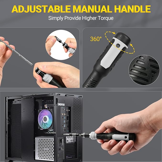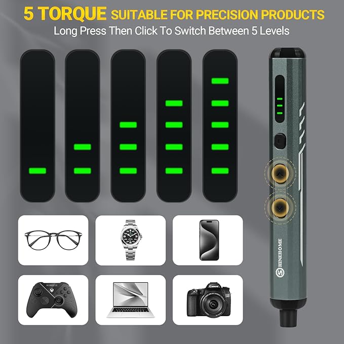 - 【5 Gear Torque For Precise Control】The electric screwdriver has 5 gears of torque, and the torque screwdriver can be adjusted from 0.15 to 0.35 N.m, plus a 5 N.m manual screwdriver, providing precise control for different jobs. The small screwdriver set has a rotational speed of up to 200 RPM, ensuring fast and efficient screwdriving.