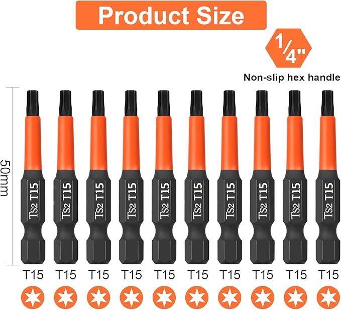Pro T15 Screwdriver Bit Set - Torx Screwdriver 10 Pieces, 50mm Length, 1/4" Hex Shank Bit Assortment, with Storage Box