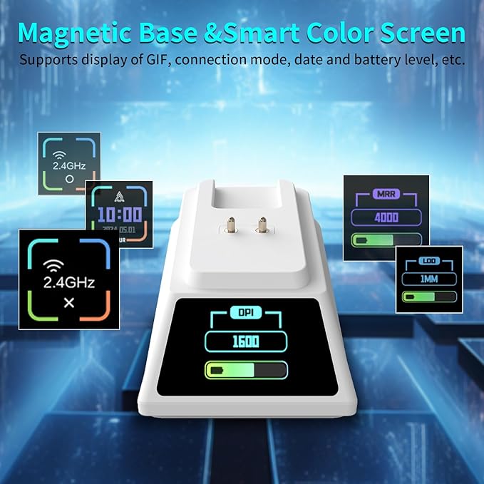 - 【Magnetic Charging Dock]】Wireless Mouse for PC AJ159 APEX comes with a magnetic charging point dock and built-in 8K receiver, RGB innovative full color interaction, built-in TFT screen to visually display the mouse status including GIF image in wireless mode, LOD, DPI, polling rate, battery level, date and more. Fast charging for long battery life.