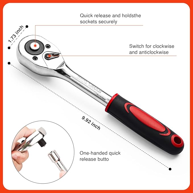 - Professional Ratchet Handle: Ergonomic easy-grip ratcheting handle could be quickly released, make you comfortably reverse the switch and let the product exceptional durability
