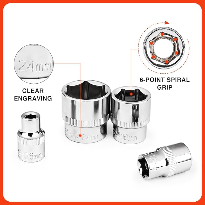 - The Set Combination: This 21 pcs 3/8 Inch Ratchet Socket Wrench Set includes 6mm, 7mm, 8mm, 9mm,10mm, 11mm, 12mm, 13mm, 14mm, 15mm, 16mm, 17mm, 18mm,19mm, 20mm, 21mm, 22mm, 23mm, 24mm;3/8”ratchet wrench*1; 5.94in extension bar*1