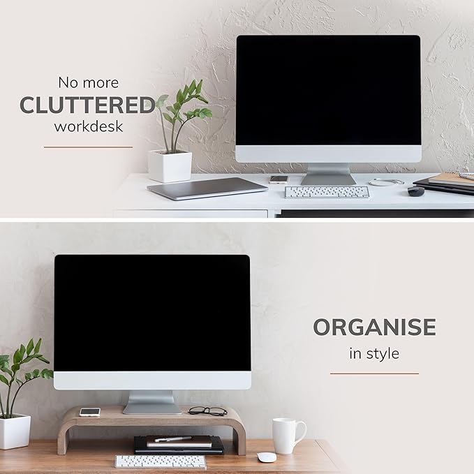 - COMPLEMENTS EVERY MONITOR DESK DECOR: These solid wooden monitor stands seamlessly integrate with any desk decor. They enhance the overall aesthetics of your workspace - be it modern, minimal or classic.