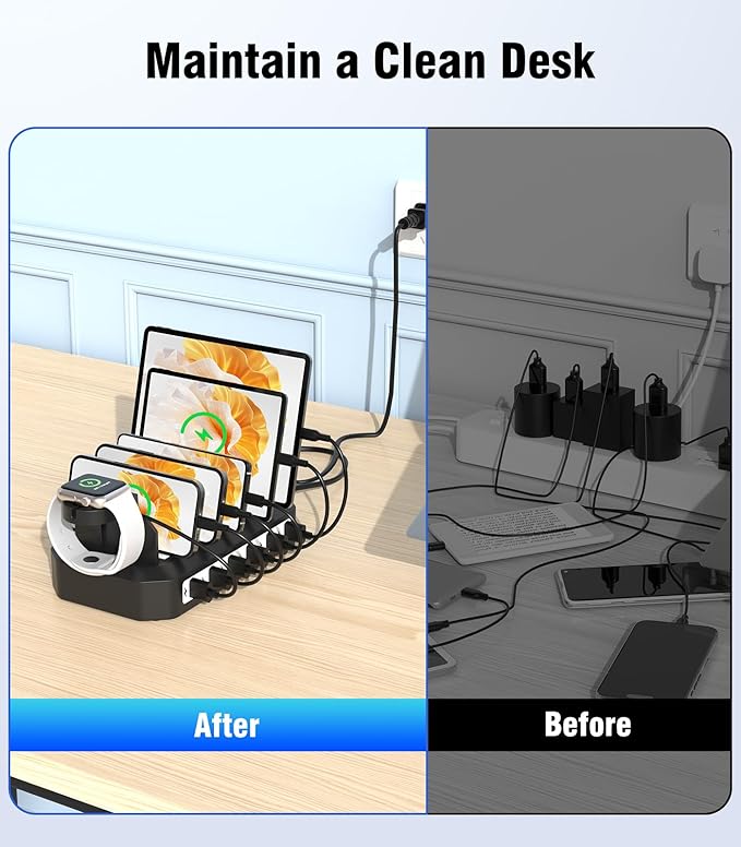 - 【Suitable for Any Occasion】The charging dock features a compact and portable design, making it easy to carry and move. You can place your desk charging station anywhere you like, whether in the bedroom, living room, kitchen, office, meeting room, hotel, or classroom.Iphone and watch charging station is the ideal gift for colleagues, friends, family, and teachers